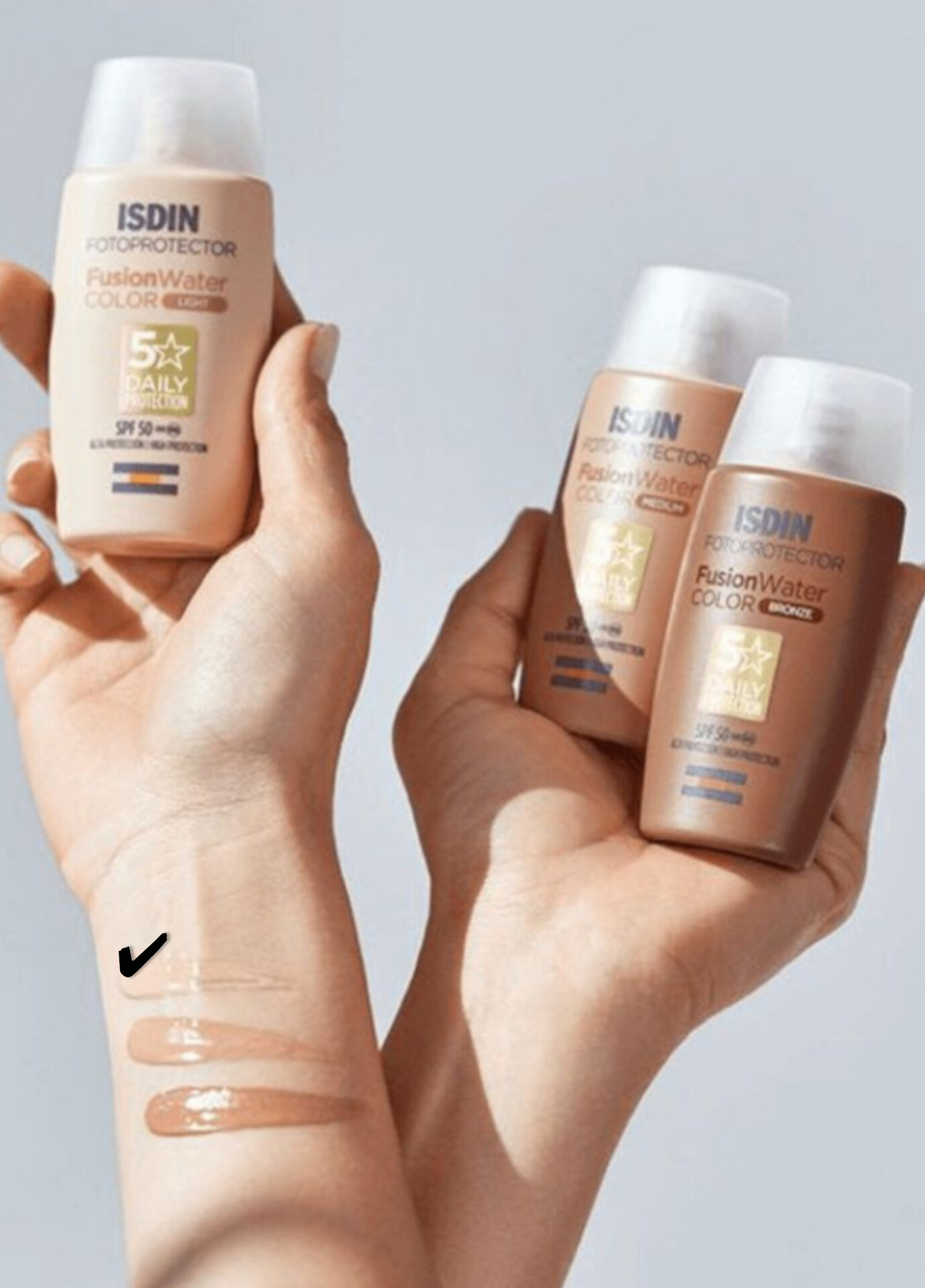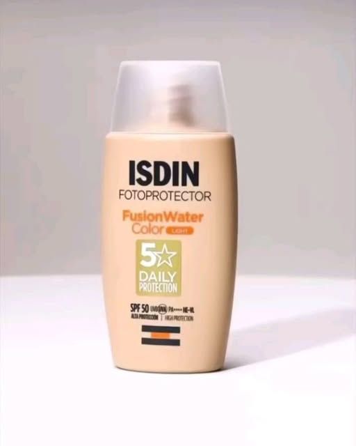 ضدآفتاب رنگی ایزدین مدل Fusion Water Light با SPF50+ و PA++++ محافظت قوی در برابر اشعههای UVA و UVB با بافت سبک و بدون چربی، با جذب سریع بدون ایجاد رد سفید مناسب انواع پوست، بهویژه پوستهای حساس و مستعد آکنه، با فرمولاسیون غیرکومدوژنیک و ضدآب.